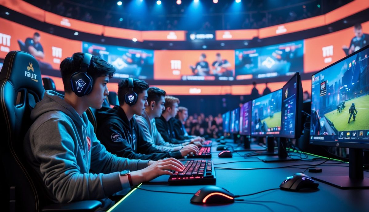 Sekelompok pemain muda sedang bermain game PUBG dalam turnamen esports besar dengan penonton dan layar besar di latar belakang.