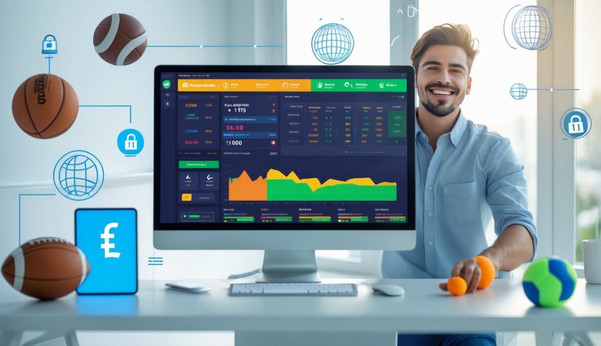 Seorang dewasa muda yang tersenyum sedang menggunakan komputer dengan tampilan antarmuka taruhan olahraga online di meja kerja modern.